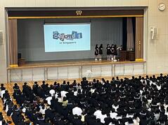 まずは「GLHS10校合同国内研修Fukushima2025」に参加した生徒から報告がありました。東京・福島を訪れ、現地の写真を交え、原発問題や東日本大震災からの復興・まちづくりなどについて、学んだこと、考えたことを話してくれました。自分の知らないことに触れ、正しい知識を得て、自分の視野を広げていくことの重要性についても語ってくれました。