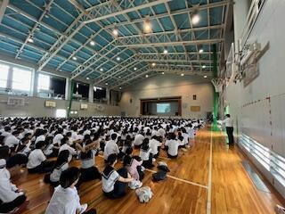 今も公式戦の真っただ中で戦い続けている人たちがいます。引き続きエールを送り続けましょう! アメリカからの留学生キベ君が自己紹介をしてくれた。体育館の真ん中まで歩む。緊張感もマックス。全校生徒が見つめ、見守る中、「私は日本語上手じゃない。めっちゃ難しい。よろしくお願いします。」息を吸う音、息が漏れる音も全部受け入れて笑顔で拍手。心の音、「意」が行き来した瞬間だった。(キべ君、私も英語上手じゃない。精進します。)