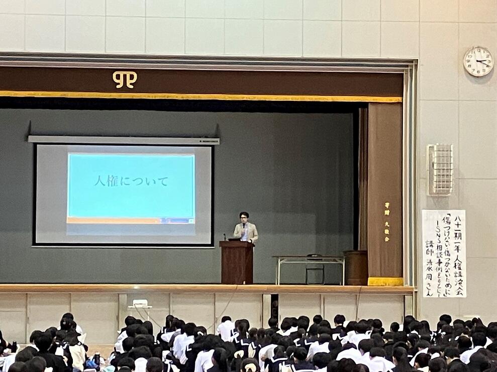 とお話しいただき、SNSでの実際の相談事例や、いじめについても、「人権をどうやって守るか」という観点で語ってくださいました。用務があって後半をお聞きできなかったのですが、身近なケースをもとに考える内容に、1年生のみなさんも自身にひきつけながら考えている様子がうかがえました。