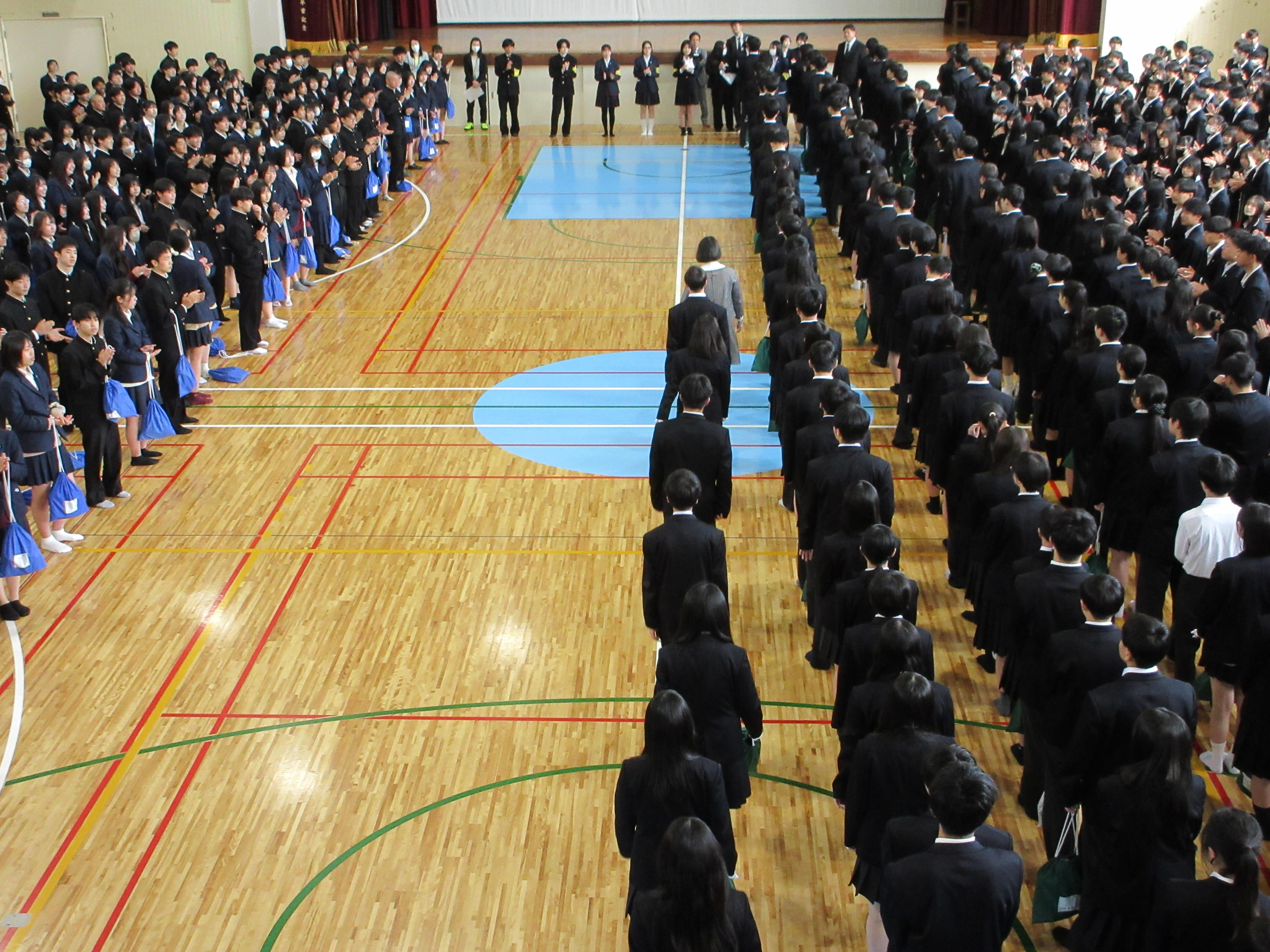 新1年生と在校生が初めて対面する場面です。在校生代表(生徒自治会役員)の生徒、新入生代表の生徒のそれぞれから挨拶をしてもらいました。