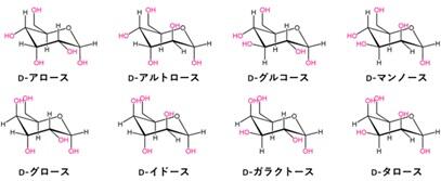 これら8種類の中で、グルコースのみが突出して自然界に多く存在することが知られています。(一般には食物繊維と呼ばれるセルロースや、炭水化物と呼ばれるデンプンの形で存在しています)何故進化の過程でグルコースは選ばれたのか。構造的にグルコースが他の7つよりも安定であると言われていますが、定量的な計算は難しく、現在でもグルコースの計算化学研究は続いています。