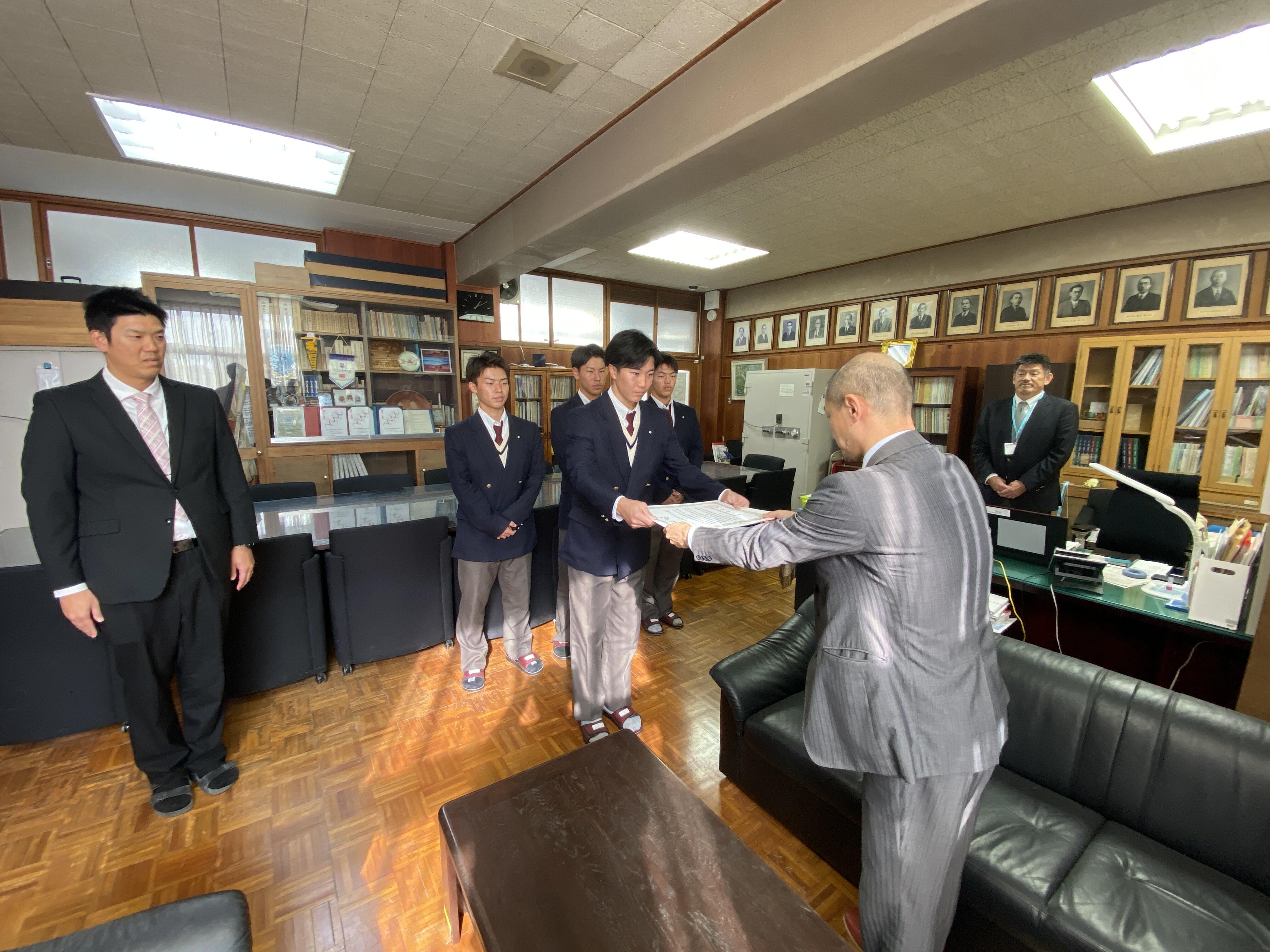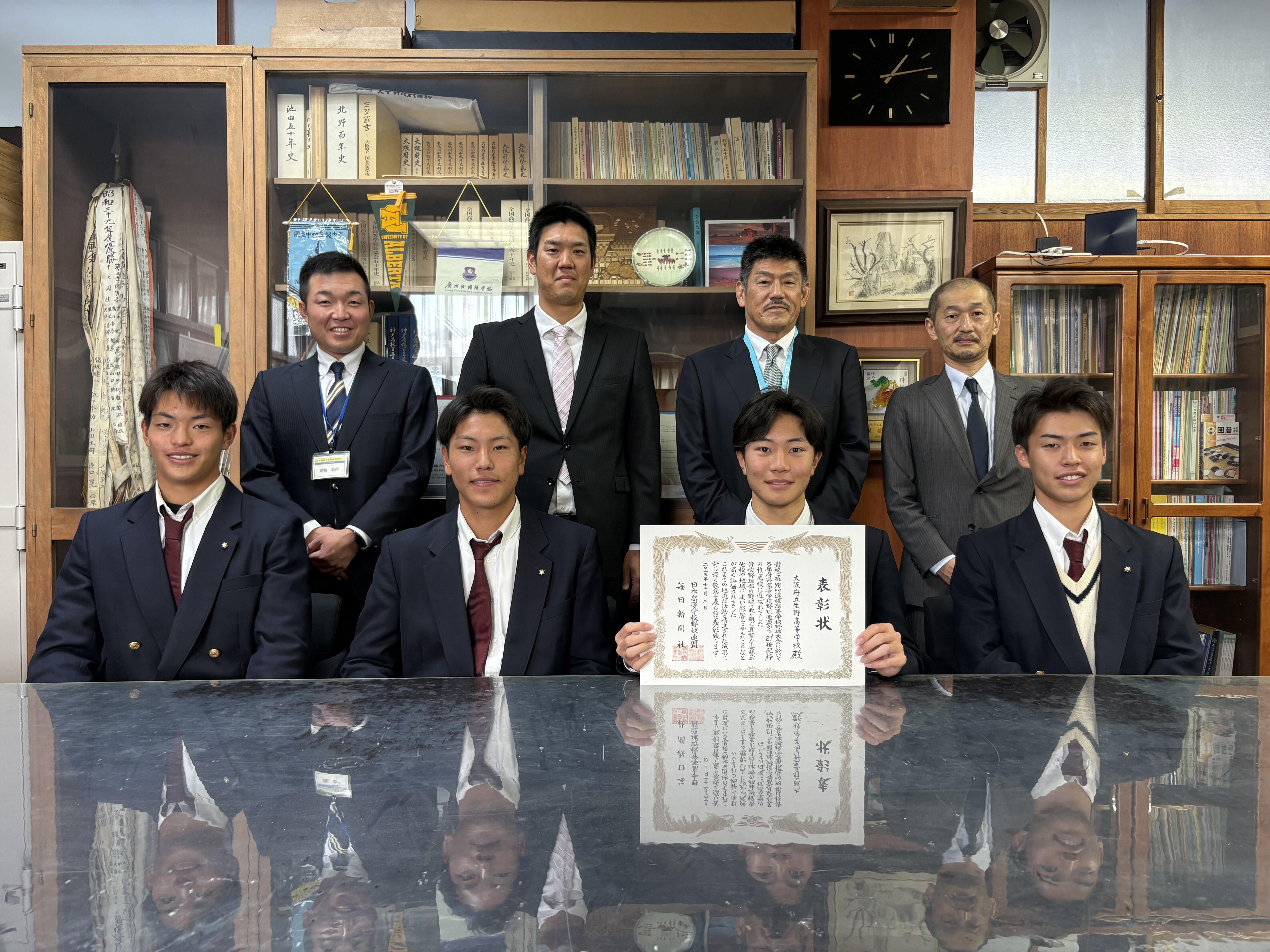 本日、毎日新聞社から、第98回選抜高等学校野球大会・都府県連盟推薦の21世紀枠大阪府推薦校に選ばれたことに対しての表彰をしていただきました。野球部としてこのように表彰していただけることは大変嬉しく思います。日頃からたくさんの方々にご支援をいただいているおかげです。同時に、このように表彰していただけるチームであり続けるために一層レベルアップしていかなければいけないと身の引き締まる思いです。オフシーズンではありますが、しっかり課題と向き合いたいと思います。