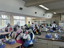 写真は、エプロンや三角巾、ハンカチなどを身につけ、いざ調理開始!というところです。このクラスはどうだったかわかりませんが、とあるクラスでは、「この鍋を使ってね」の指示に対し、大部分が間違ったクラスがあったそう...調理実習でテンションが高くなるのはわかりますが、注意等はきちんと聞いて取り組まないといけませんね!