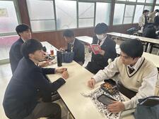 写真は考査を終えた3年生の様子です。リラックスしている人あり、考査について検討している人あり、「ブログ用の写真撮っていい?」と尋ねると慌てて教材を出す人あり(笑)、卒業アルバムの写真を選別している人ありと、思い思いの時間を過ごしていました。やはり、受験や進路に関する不安を抱えている人もこの時は、苦楽をともに過ごした仲間とともに生き生きした表情です。