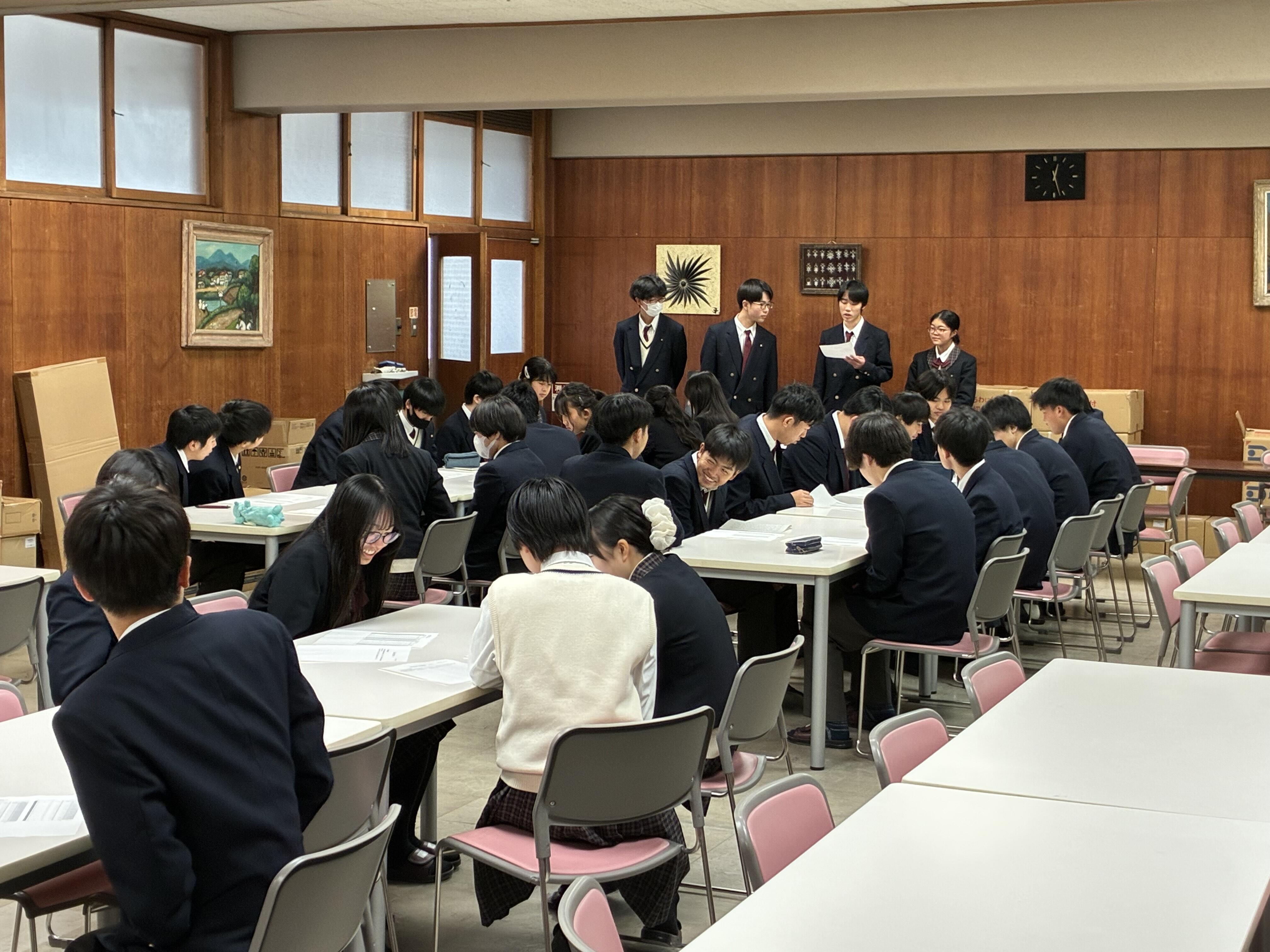 もう1枚は、昼休みに行われた議会の様子です。教員なしの会議ですが、撮影者としてお邪魔しました。自治会執行部の生徒が、次年度の部援助費について、1・2年生の各クラスの議員に伝達していました。