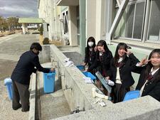 その後は大掃除を実施。来週に高校入試を控え、1年間の汚れを落としつつ、教室整備も並行して進めました。写真は順に、ごみ箱をキレイにしている1年生、下足室出入口の泥汚れを落とす2年生、男子更衣室清掃を終えた1年生です。