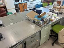 職員室も閑散とした印象。明日の朝は、職員室の引っ越し作業から始まります。作業に向け、すでにきれいに整理された机、移動の準備を終えた机ありといった様子です。
