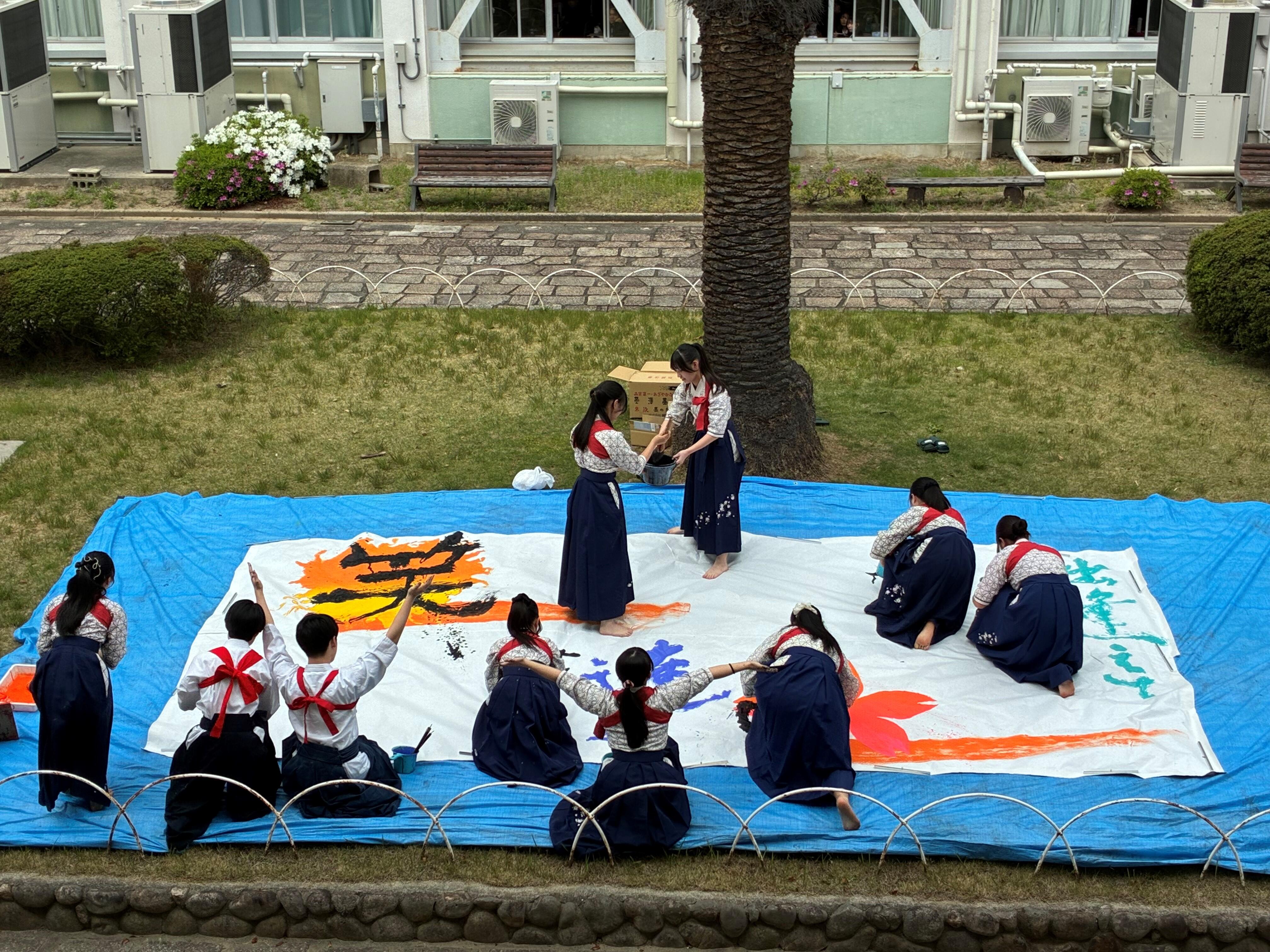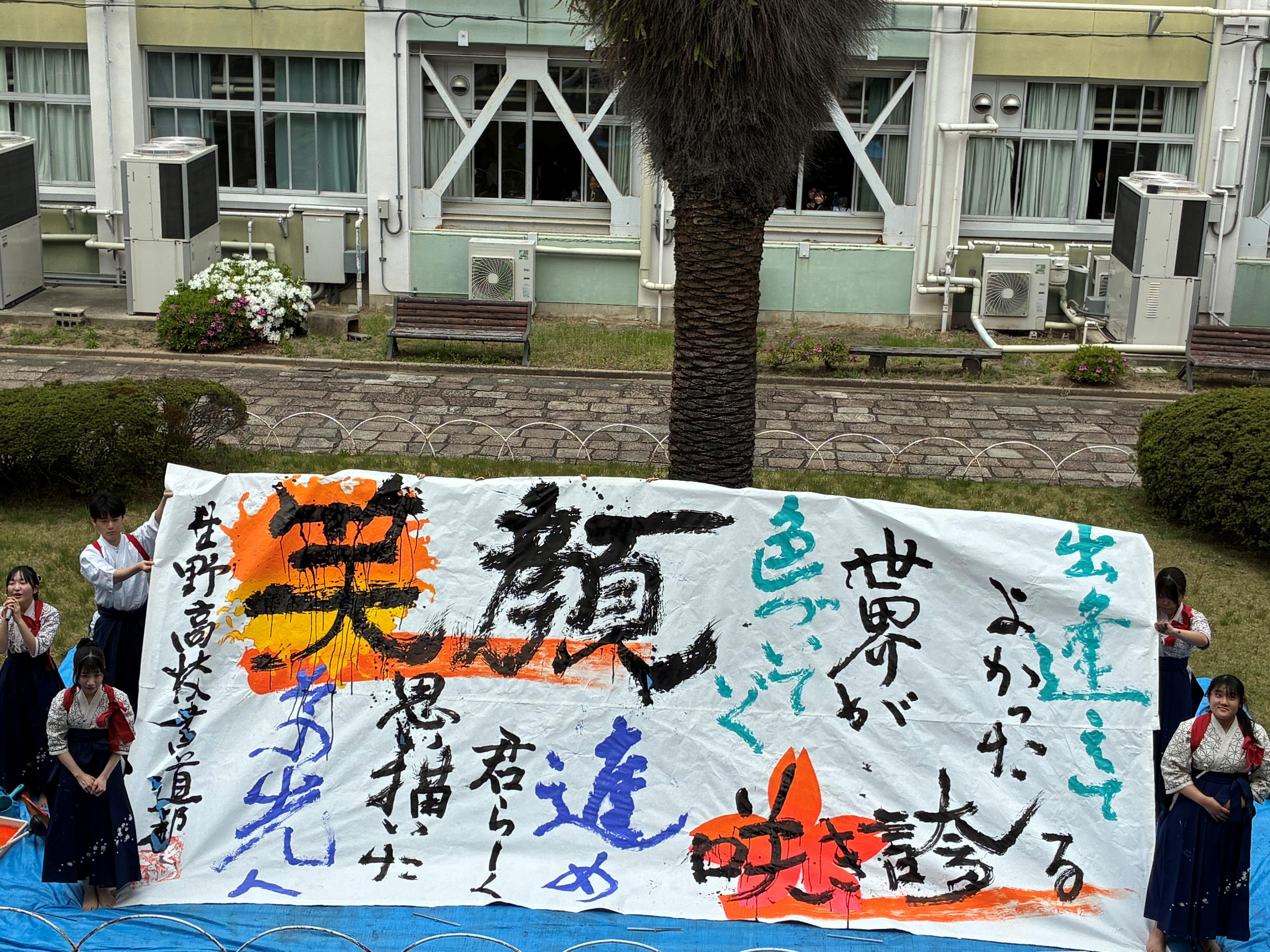 大きな紙に、大小様々な筆で力強いメッセージを書いてくれました。作品はもちろんのことながら、曲に合わせて、「届け!!」と声を揃えての呼びかけ、完成後の「笑顔たくさんの高校生活を!」というメッセージも非常に良かったです!!