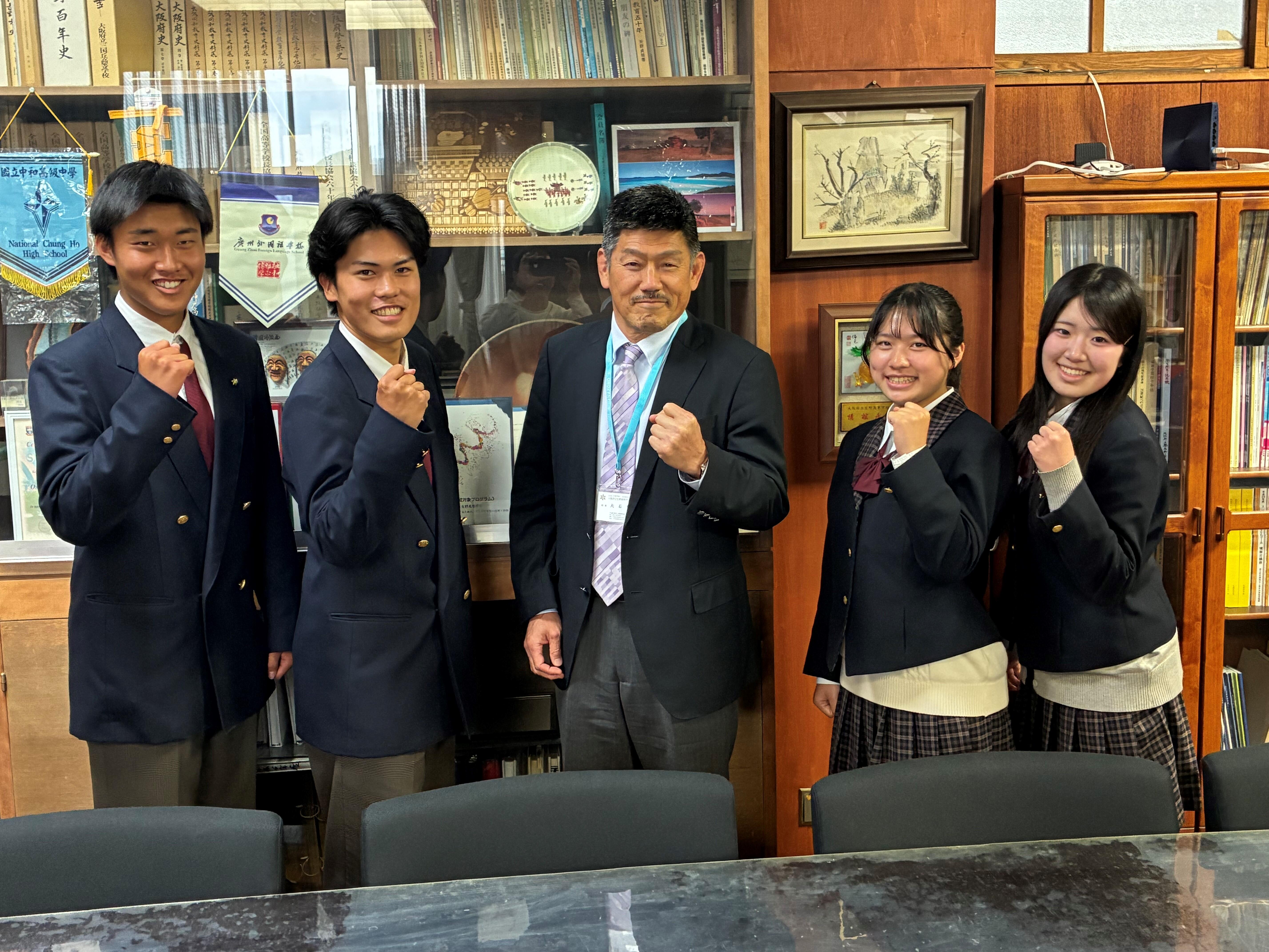 本日昼休み、79期3年生の体育祭応援団長達が、校長先生に挨拶をしに訪れていました。非常に明るく、良い雰囲気で自己紹介等していました。挨拶を終え、退室か...というところで、「校長先生と一緒に写真が撮りたいです」と申し出が(笑)非常に良い写真となりました!!