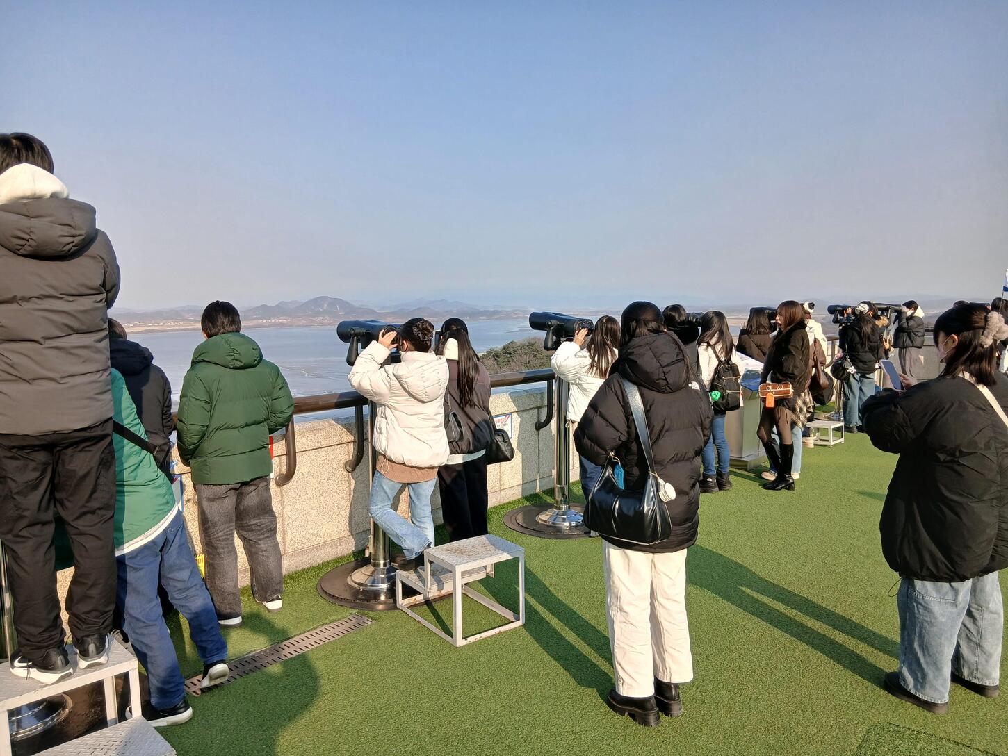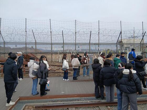 本校生徒の韓国研修3日目は、朝ホテルを出発し、バスで約1時間かけて北朝鮮と韓国の軍事境界線(DMZ)付近を訪問しました。最初に訪れた展望施設では、南北分断の歴史について学ぶとともに、双眼鏡を使って北朝鮮側の様子を実際に観察しました。遠くではありますが、人が動いている様子を目にし、生徒たちは強い関心と驚きをもって見入っていました。