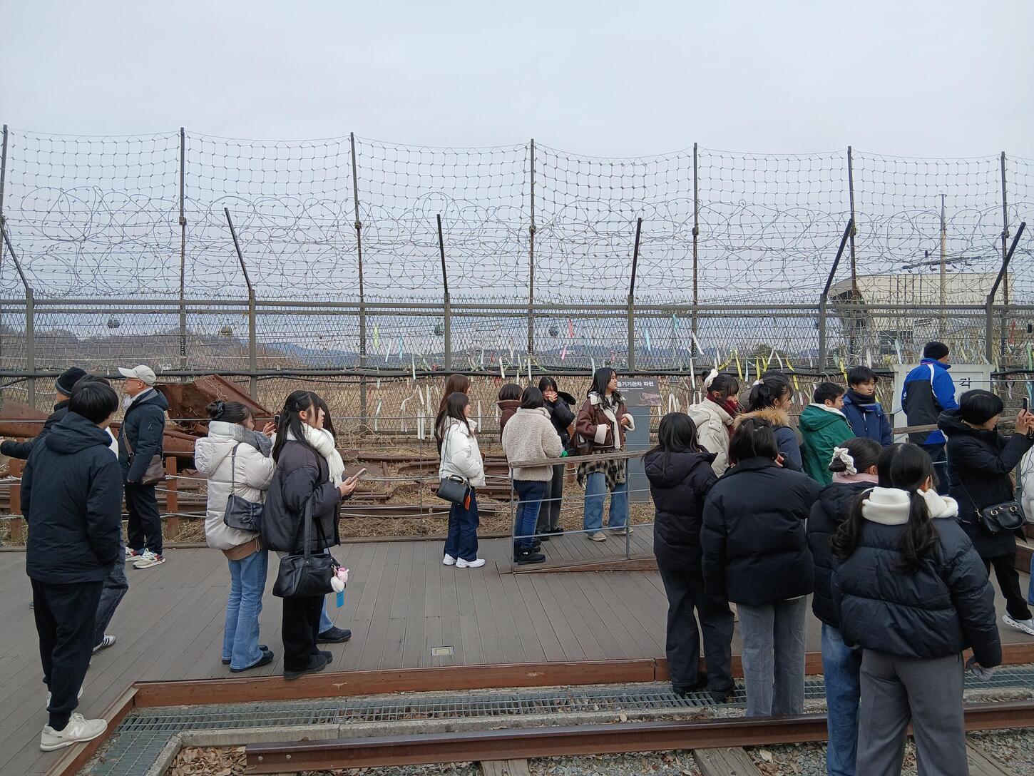 その後、イムジンガク平和ヌリ公園へ移動しました。ここでは、南北を隔てる有刺鉄線のフェンスや、平和を願って建てられたさまざまなモニュメント、かつて南北を結んでいた鉄道の線路の一部などを見学しました。歴史を「知識」として学ぶだけでなく、実際の場所に立つことで、平和の尊さや分断の現実について考える貴重な機会となりました。