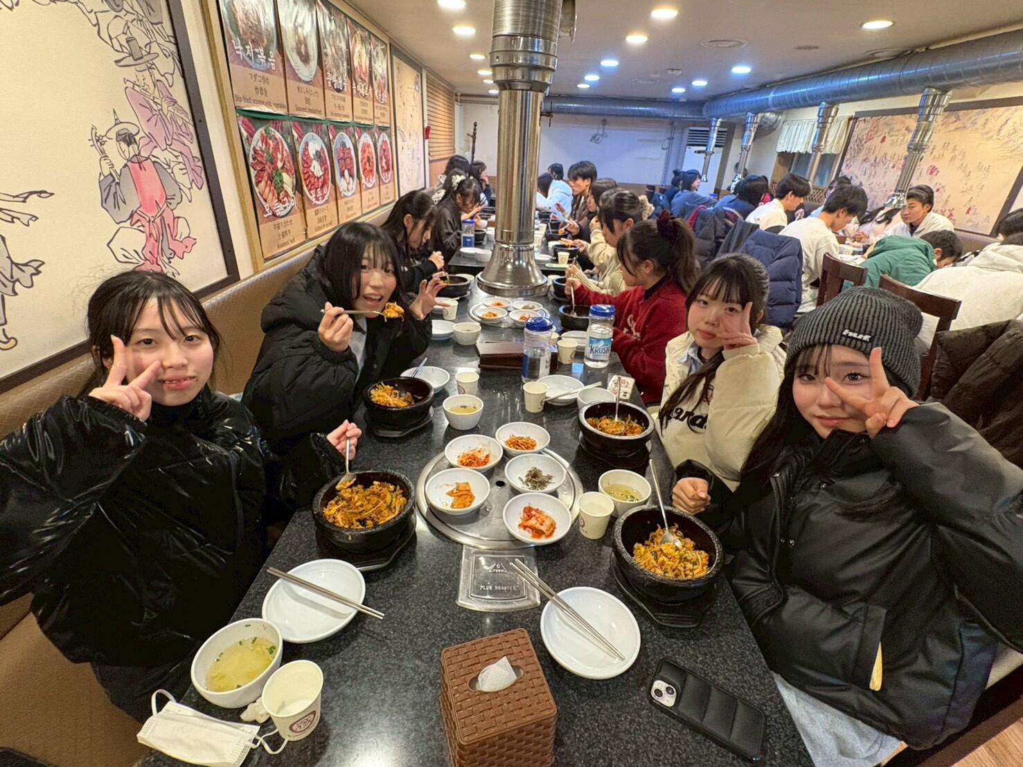 見学後はソウル市内へ戻り、石焼ビビンバの昼食をとりました。しっかりとエネルギーを補給した後は、キョンヒ大学を訪問し、現地の大学生によるキャンパスツアーに参加しました。その後は少人数のグループに分かれ、大学生の皆さんとともに街に出て、食事やショッピングを楽しみました。この時間は引率教員が同行しなかったため写真はありませんが、生徒たちにとっては、より主体的に異文化交流を行う大変貴重な経験となりました。