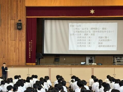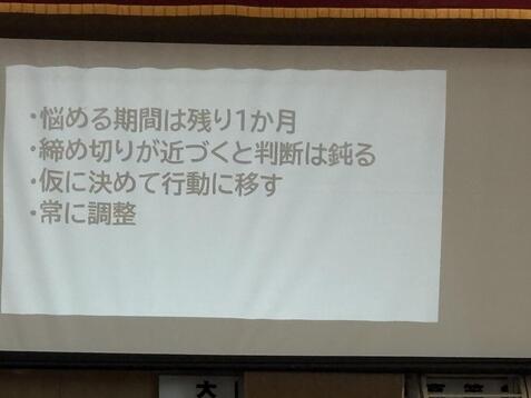 先生のお話で非常に心に残った言葉は「進路選択が、退路選択になってはいけない」という言葉でした。また、締め切り前には、大学の入試科目調べのHRも行います。