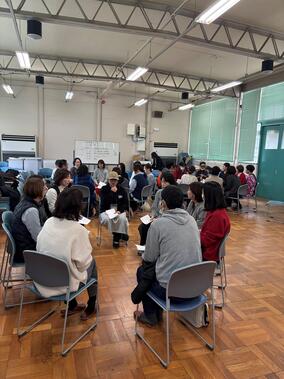最初は学年混合の4グループに分かれ、その中にPTAのOBさんが混ざっての座談会でした。非常に盛り上がり、終わっていただくのが申し訳ないぐらいでした。その後は、学年ごとに分かれました。私は1年生のお話に混ぜていただきました。「成績表見せますか?」「おうちでのスマホのルールは決めていますか?」「親も受験の情報を調べたりしますか」...などなど、保護者目線のお話がたくさん聞けて、私もとても参考になりました。またOBさんからは「受験勉強のやる気スイッチが入ると、スマホのアプリをどんどん消し始める」というお話があり、「それって大体何月ぐらいですか?」逆に私が聞く場面もありました。