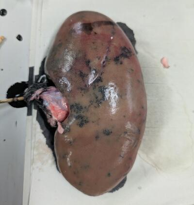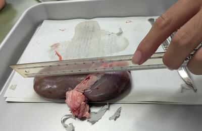 ブタの腎臓はヒトとほぼ同じ大きさです。(ヒト腎臓の平均:縦12㎝、横6㎝、厚さ3㎝、重さ150g)