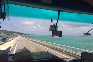 読谷村を後に一行は古宇利島へ向かいました。きれい~! 島に渡る橋を行くバスの車窓から見える景色に歓声が上がります。エメラルドの海が長い橋の両側に広がっています。