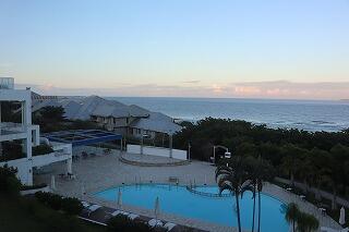 部屋のカーテンを開けると、昨夜に全体レクで大いに盛り上がったステージの向こうに美ら海が広がっていました。沖縄は今日も良い天気に恵まれそうです。