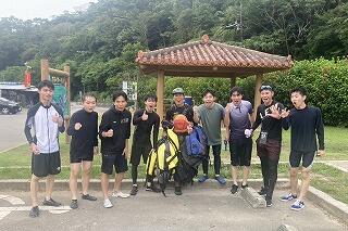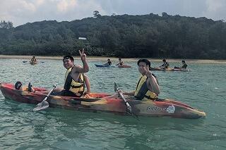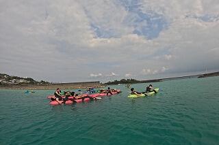 今日は、午前と午後に、マリン+カヤック、グラスボート、宮城島外周カヤック、シーサー作り、グラス作り、ター滝トレッキングの6つのアクティビティの中から1つずつ選んで、それぞれの場所へ移動し活動します。