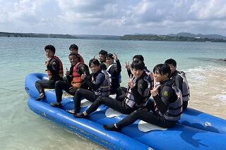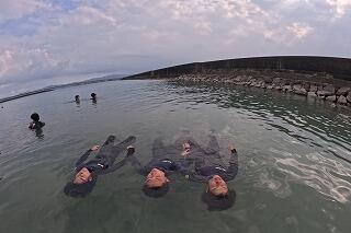 マリン体験は、はじめにインストラクターからのウェットスーツの説明や海での注意事項などの話を聞いてから、スーツと救命胴衣を着て、ボートを曳いてもらったり、カヤックを体験したり、フリータイムを楽しんだりしました。