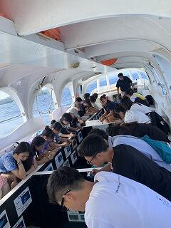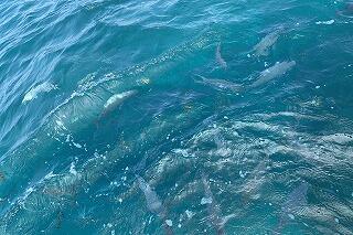 グラス越しに船底を見ると、美ら海の中がよく見えます。大阪湾では見られないキラキラした魚や、大きな魚の群れも見ることができました。