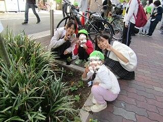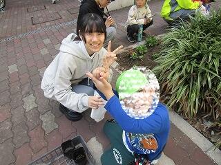 今回は、いつも一緒に参加してくれる大国保育園園児約15名のほかに、愛染橋保育園の園児も20名ほど参加してくれ、高校生と1対1でのペアを組み、一緒に花を植えることができました。