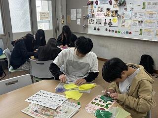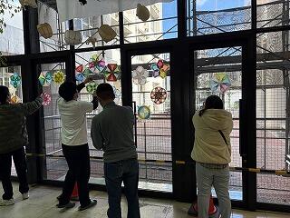 ソレイユの生徒たちが「自立活動」の授業の中で、このステンドグラスの飾りつけに取り組んでいて、ワークショップという形で放課後に総合学科の生徒にも教えながら、一緒にたくさん仕上げてくれました。(先生たちも大勢駆けつけ、作ってくれていました!)