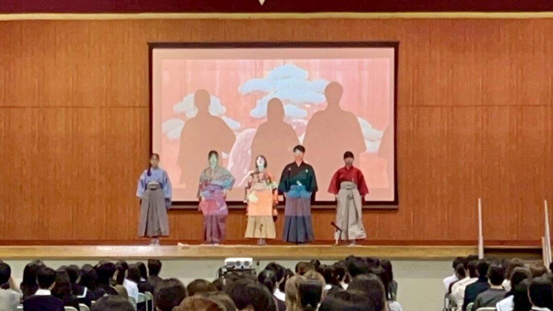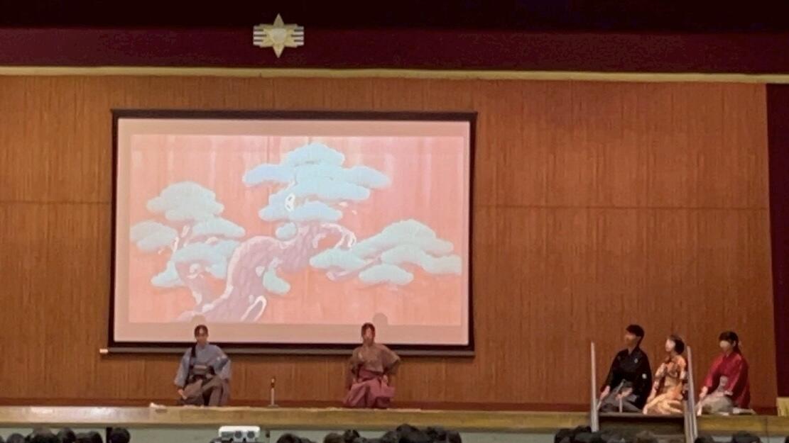 10月25日(土)今宮高校のオープンスクールがあり、能楽部は、オープニングセレモニーに出場させていただきました。体育館の晴れの舞台で、中学生や保護者を前に、2年生が土蜘(つちぐも)を披露しました!