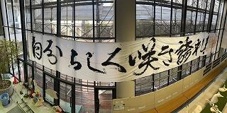 本日3,4限に、本校玄関ロビーの「芸術の森」を彩ってきた「書画」の大きな横断幕が、3年「HL書道」選択10名の生徒たちによって制作された新しい作品に掛け替えられました。 「自分らしく咲き誇れ!」、10人がいっぱい時間をかけて、考え、考えて、できた10文字を10人で一文字ずつ書きました。今高生全員に、そして、これから入学してくる後輩たちに贈るメッセージ、今高らしくてとてもいい感じです。 今...