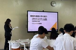 関西外国語大学のような語学の単科大学は、オールイングリッシュの授業や充実した留学制度があることなど、英語学習環境が整っていること、外国語学部では英語を使える力と勇気が身につくこと、そして、身に着けたビジネスクラスの英語力はビジネス社会でも高く評価され、生涯にわたって役立つスキルとなることなど、十分な英語力を身に着けることが、いかに将来に役立つかについて話されました。