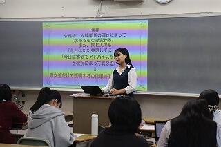 はじめに教頭先生から、本日の予定や資料の確認等があり、早速5時間めの授業を見学しました。この時間は全学年探究学習の発表の時間です。