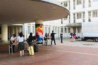 今朝7時半、出勤するとすでにトラックが1台停車していて、2年の先生方が長机を並べて大きな荷物を持って登校してくる生徒を待たれていました。