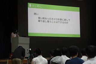 本日の5,6限、多目的ホールで3年「未来探究」代表者発表会が行われました。各クラスで代表に選出された12組13人の発表者が、各5分の持ち時間で発表を行います。また、5限は発表のようすがLIVE配信され、2年生が各教室で視聴しています。