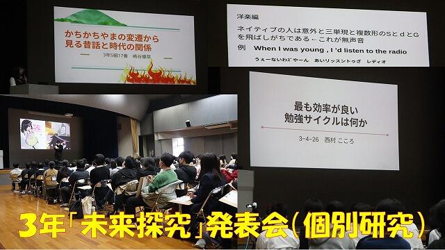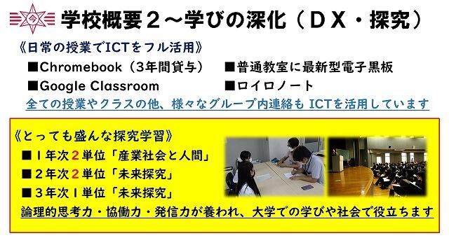 続きです。総合学科のもう一つの大きな特徴である「充実した探究学習」の取組みや、進学講習など本校独自の学力向上の取組みと進路実績等について説明する場面です。