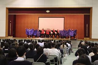 次にダンス部がソーランのオリジナルを披露しました。元気とパワーを発信し続けて26年、大阪メチャハピー祭?連覇、全国大会?連続出場中で、国際大会にも出場するダンス部のパフォーマンスはいつも圧巻です。