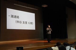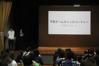 午後1時、多目的ホールに集合し、開会行事が行われました。司会進行は現役放送部の2人です。