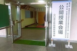 防府市西部に位置する、周防灘を望む風光明媚な大道地区にあり、1学年4クラスの生徒達が通っています。全国から集まった総合学科高校の私達のために、時間割変更をして始業時間もずらせて、9時10分から1年生が「産業社会と人間」で取り組んできたポスター発表会(クラス発表会)の見学ができるようにしていただきました。テーマは地元「大道を盛り上げよう」です。ある教室で、生徒が北海道旭川市の取組みを例に挙げて、「大道でもできるのでは」と提案していたところ、発表後の質疑応答の時間に、ちょうど後ろで見学していた先生が手を挙げて、「私は北海道旭川市から来ました。ここで、こんなに詳しく旭川のことを調べてくれている生徒さんがいるとは思いませんでした。感激しています。有難うございました。」と話され、生徒達も驚いていました。