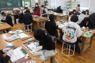 さて、今日は先週金曜日11月7日時間めに見学した2,3年自由選択科目の「工芸実習」の紹介をします。内容はステンドグラスの壁掛け鏡と小箱の制作です。担当は伊藤先生、ソレイユの生徒を含む18人の生徒が学んでいます。