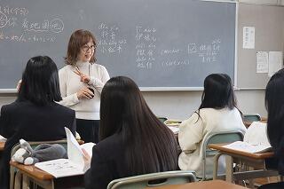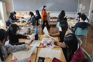 11月19日(水)4時間めに袁先生の「中国語文化研究」を見学しました。今年度は4人の生徒しか選択しませんでしたが開講して教えていただいてます。見学してみると、袁先生は、一つ一つの文の構成について文法的に細かいところまで正確に教えられていて、それらをすべて生徒達が理解していることに驚きました。習い始めて半年余りでこんなにも分かるようになるのでしょうか。