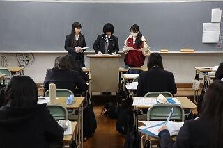 5時間めの3年「私達が立っている場所」は小山先生が本校で26年間続けてこられた現代文の授業で、おもに評論の深い読解を通して、ことばを的確に理解し、適切に表現し伝え合う力を育成し、ことばの学習が現代社会に生きる私達の「生きる力」につながるような視点を常に保持することを大切に学習が進められています。