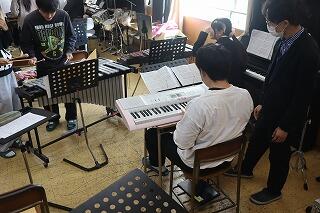 課題曲は「スタジオジブリメドレー」です。この時間が最後の練習時間。次回の12月19日(金)の1時間めに発表します。先生が巡回しながら、リズムやメロディ、合わせのポイントを教えられていました。生徒達はとても熱心です。