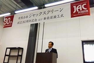 2か月ほど前、私宛に八尾市にあるJACスクリーンという会社から、「創立30周年及び新社屋竣工式」の招待状が届きました。JACの'J'は'JAPAN'、'A'は'ART'、'C'は'CREATOR'、おもにさまざまな種類の看板やディスプレイの設計・施工を行う有限会社で、「看板を通じて新しい風、空気、そして共感を運び、人の集いが始まります。多くの人の目に止まり誘う大切な要素が「sympathy design」だと考えます。共感で溢れるお店創り・会社創りで街中が共感溢れる社会を実現するのが私達の夢です。素材や質感にもこだわり、人の集いを想像します。」という企業ポリシーをお持ちです。社長の今岡さんとは、前任校&前々任校のときに知り合いました。