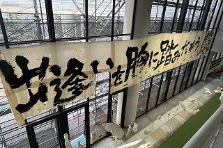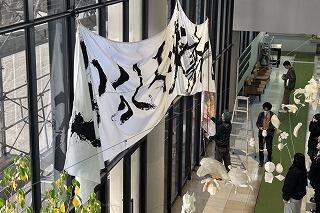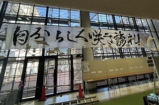 本日3,4限に、本校玄関ロビーの「芸術の森」を彩ってきた「書画」の大きな横断幕が、3年「HL書道」選択10名の生徒たちによって制作された新しい作品に掛け替えられました。