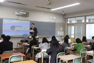 今日は3時間めに学校設定教科「金融」の学校設定科目「FP基礎」を見学しました。担当は、日本FP協会大阪支部から来ていただいている特別非常勤講師の大熊先生です。