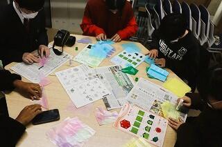 今日の放課後、200教室に多くの生徒や先生方が集まりました。上履きを抜いて絨毯敷の教室に入ると、机の上には透明感のある綺麗な折り紙がたくさんありました。ソレイユの生徒と一緒に皆でステンドグラスづくりにチャレンジです。