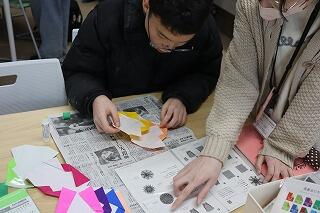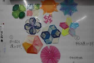 ステンドグラスのいろいろな折り方が示されたプリントを見ながらでも結構難しそう。それでも、皆、根気よく丁寧に折り重ねて美しい幾何学的な模様のステンドグラスを作っていました。