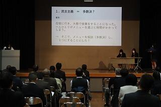 本校の舞台発表は、社会科の西口先生が担当されている学校設定科目「もうひとつの現代社会」の実践報告を、前半は西口先生による説明、後半は選択生徒による授業の再現シーンを演じました。
