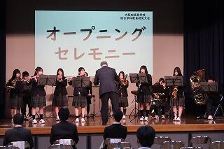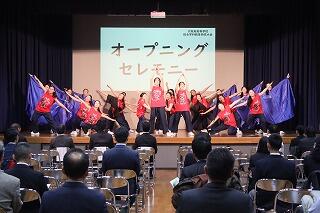 多目的ホールでの開会式に先立って、オープニングセレモニーが行われました。本校吹奏楽部の演奏「硝子の少年時代」と、ダンス部のパフォーマンス「今宮ソーラン」で参加された皆様をお迎えし、大きな拍手をいただきました。