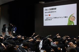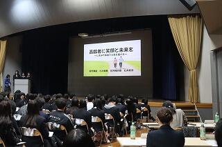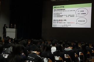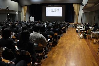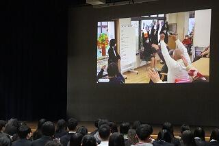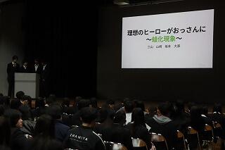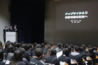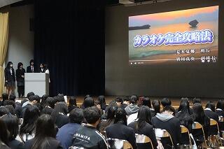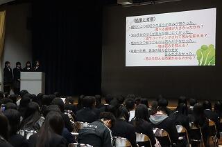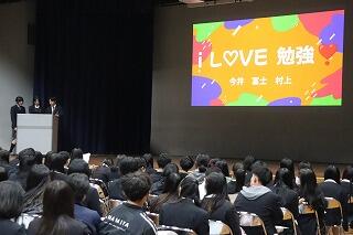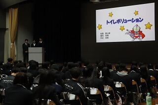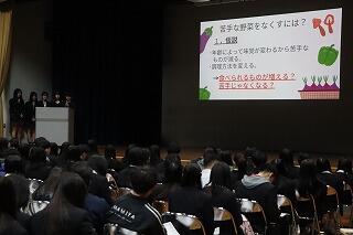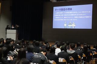 今回発表するのは、テーマ別発表会で選ばれた代表の9班です。発表時間は7分。司会やタイムキーパーなど進行は全て生徒が行います。また、ゲストコメンテーターとして、学校運営協議委員の自彊会会長の新居様、PTA会長の船山様、大阪市立木津中学校長の田中先生、石井記念愛染園で前PTA会長の村田様、大国保育園長の西野様、エール学園の浦瀬様にお越しいただきました。ご多用の中、有難うございます。