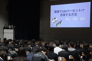 はじめは、「面接で100パーセント⁉合格する方法」のタイトルで、第一印象が面接試験にどれだけ影響するかについて詳しく調べ、実際に企業の人事担当に訊くフィールドワークや実証実験などの研究を通じて発表していました。仮説に反し、メラビアンの法則のとおり、概ね第一印象は重要であることが分かったようです。