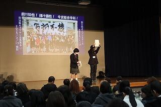 続いて、放送部の司会のもと資料の確認を行い、私からスライド資料に沿って今宮総合学科の教育の理念や特徴、様々な教育の取組み等について説明しました。